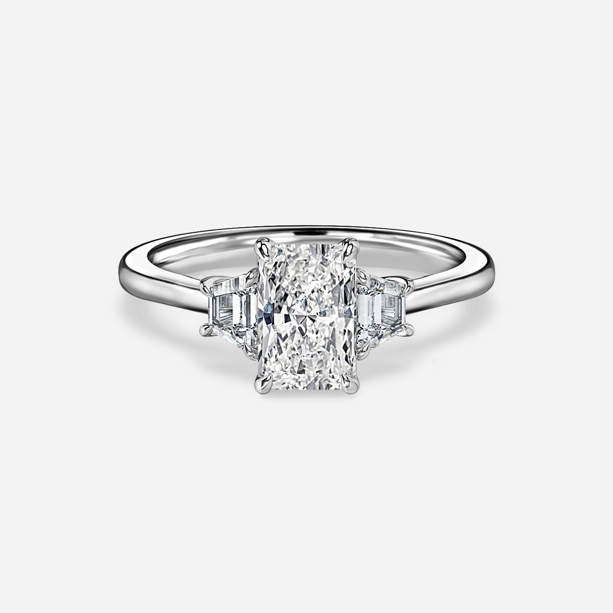 This gorgeous platinum trilogy engagement ring features three stones that represent the past, present, and future. Its timeless beauty is accentuated by two trapezoid stones on each side for a truly unique look. Handcrafted in Hatton Gardens, London. Centre Diamond Not Included Setting only