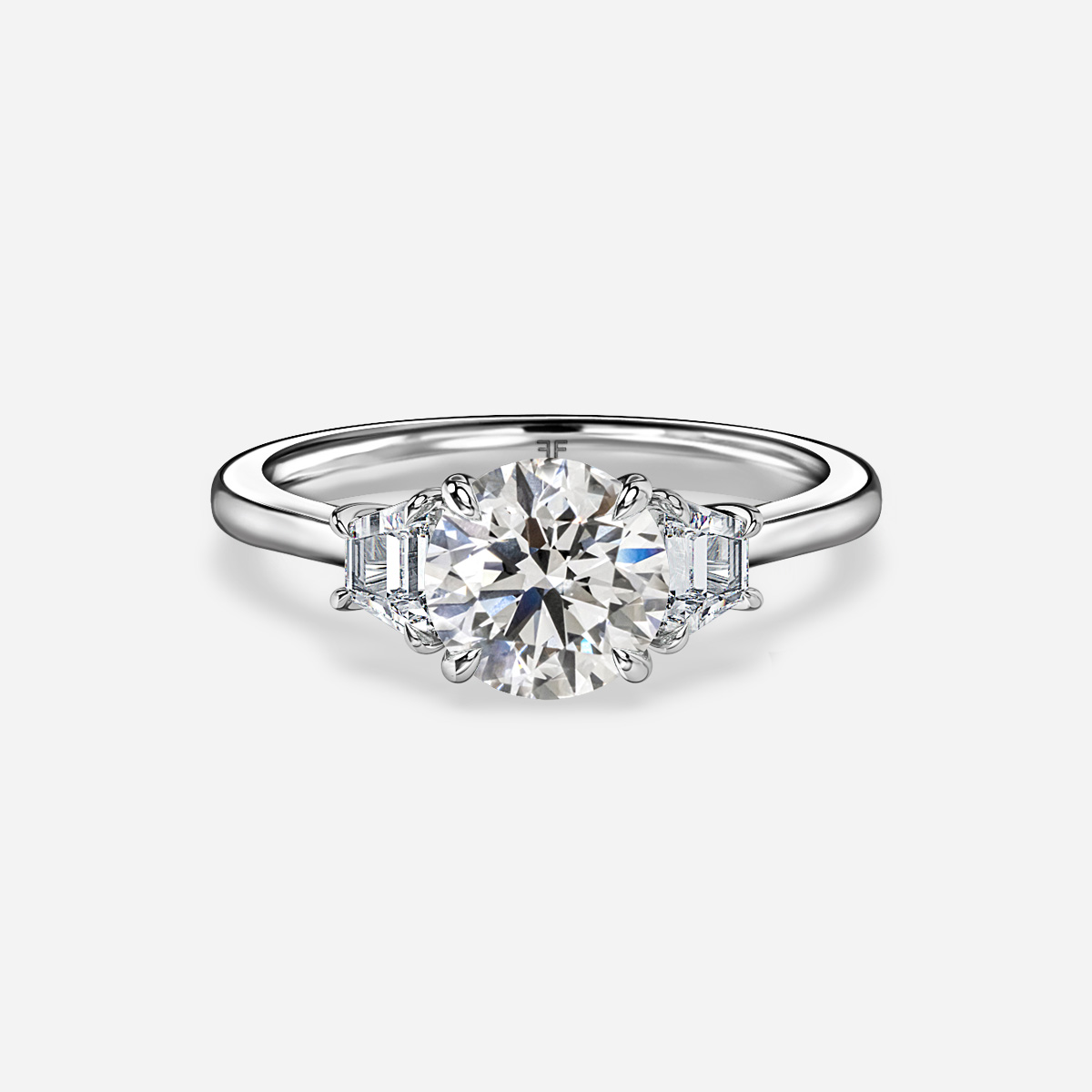 This gorgeous platinum trilogy engagement ring features three stones that represent the past, present, and future. Its timeless beauty is accentuated by two trapezoid stones on each side for a truly unique look. Handcrafted in Hatton Gardens, London. Centre Diamond Not Included Setting only