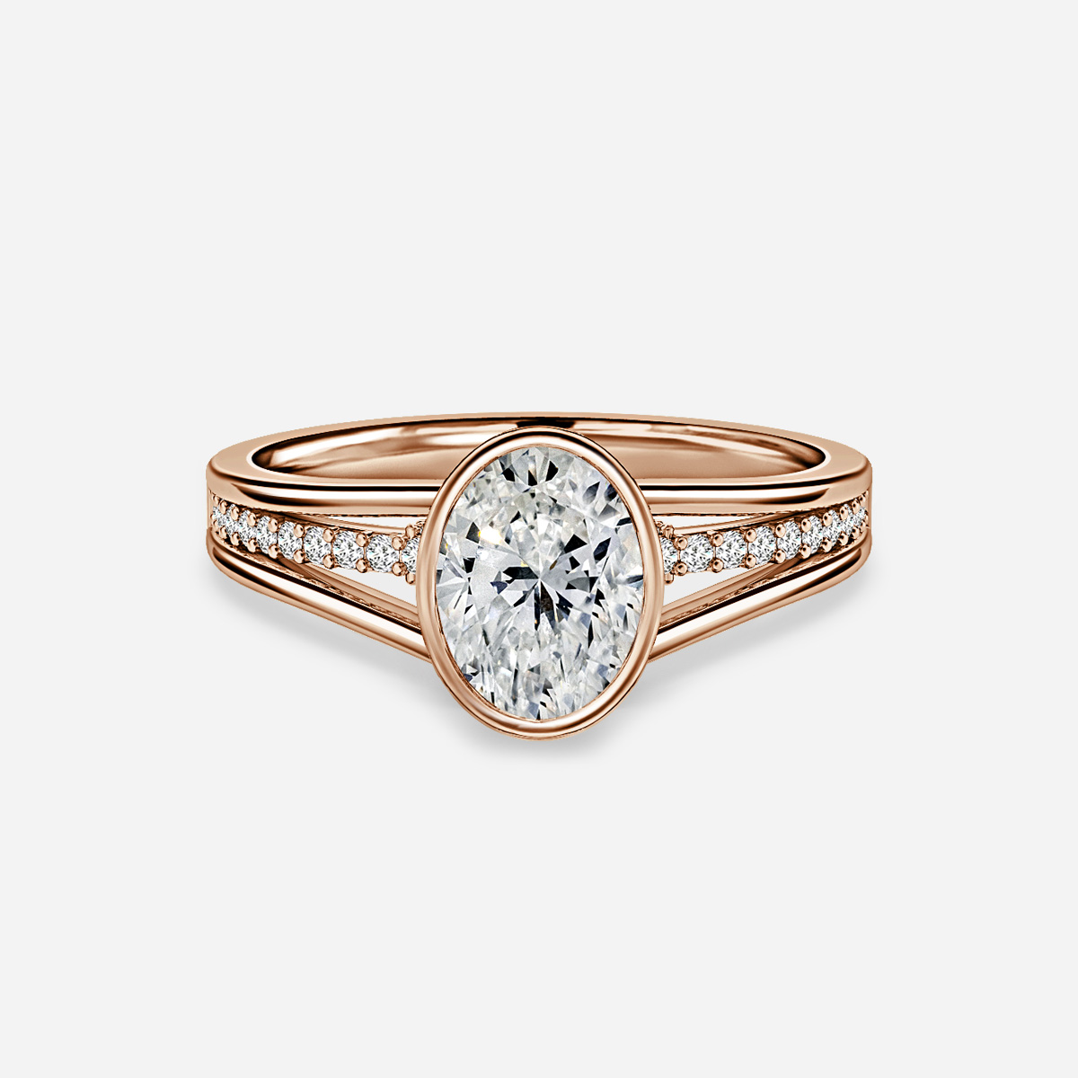 Elevate your love story with the Veda Rose Gold Bezel Engagement Ring, featuring a stunning diamond cascading from band to bridge along a gracefully split shank. Embrace the allure of intricate design and unparalleled beauty in this symbol of eternal devotion. Handcrafted in Hatton Gardens, London. Centre Diamond Not Included Setting Only