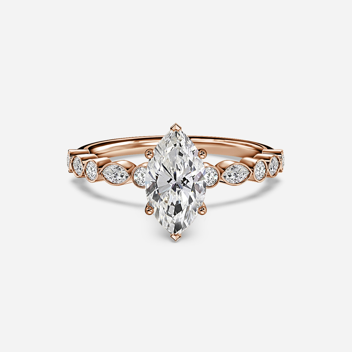 This rose gold bezel style engagement ring features alternating round and marquise shaped diamonds creating an alluring pattern which is an elevated choice for your beloved. The comfort-fit of a ring indulges the one you adore. Handcrafted in Hatton Gardens, London. Centre Diamond Not Included Setting only