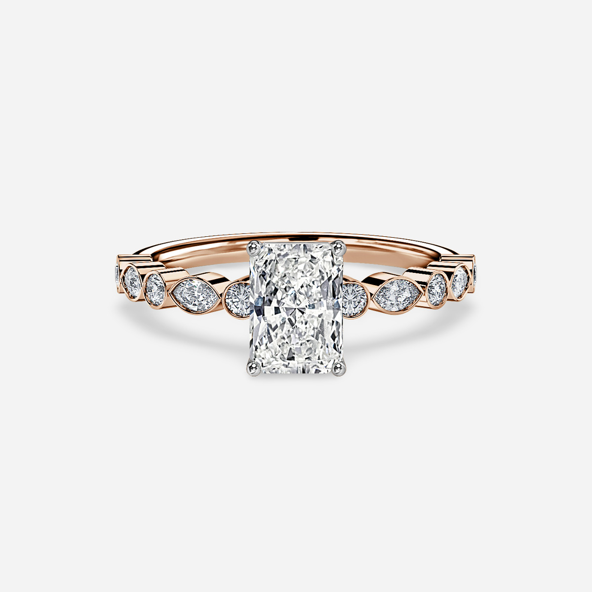 This rose gold two tone bezel style engagement ring features alternating round and marquise shaped diamonds creating an alluring pattern which is an elevated choice for your beloved. The comfort-fit of a ring indulges the one you adore. Handcrafted in Hatton Gardens, London. Centre Diamond Not Included Setting only