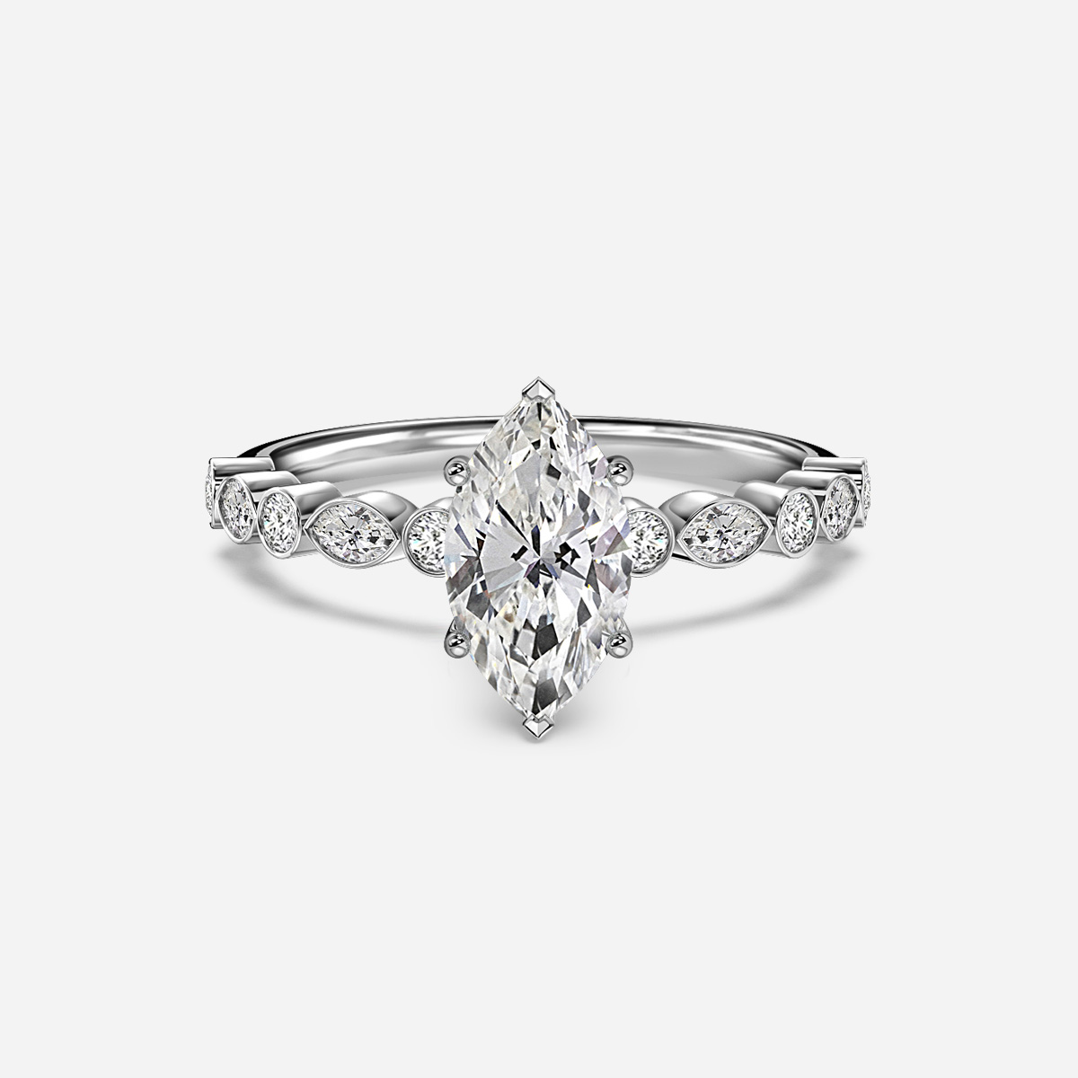 This white gold gold bezel style engagement ring features alternating round and marquise shaped diamonds creating an alluring pattern which is an elevated choice for your beloved. The comfort-fit of a ring indulges the one you adore. Handcrafted in Hatton Gardens, London. Centre Diamond Not Included Setting only