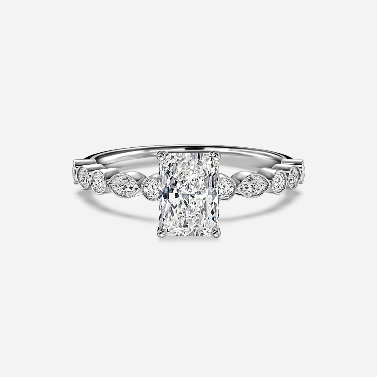 This white gold gold bezel style engagement ring features alternating round and marquise shaped diamonds creating an alluring pattern which is an elevated choice for your beloved. The comfort-fit of a ring indulges the one you adore. Handcrafted in Hatton Gardens, London. Centre Diamond Not Included Setting only