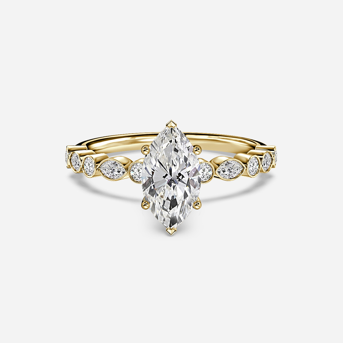 This yellow gold bezel style engagement ring features alternating round and marquise shaped diamonds creating an alluring pattern which is an elevated choice for your beloved. The comfort-fit of a ring indulges the one you adore. Handcrafted in Hatton Gardens, London. Centre Diamond Not Included Setting only