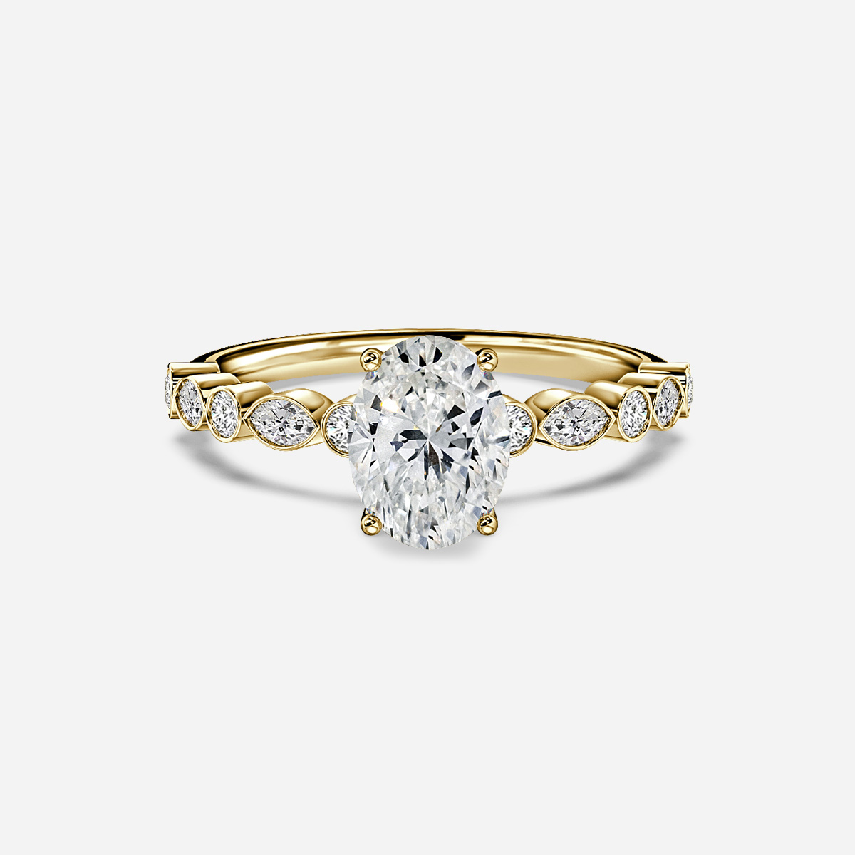 This yellow gold bezel style engagement ring features alternating round and marquise shaped diamonds creating an alluring pattern which is an elevated choice for your beloved. The comfort-fit of a ring indulges the one you adore. Handcrafted in Hatton Gardens, London. Centre Diamond Not Included Setting only