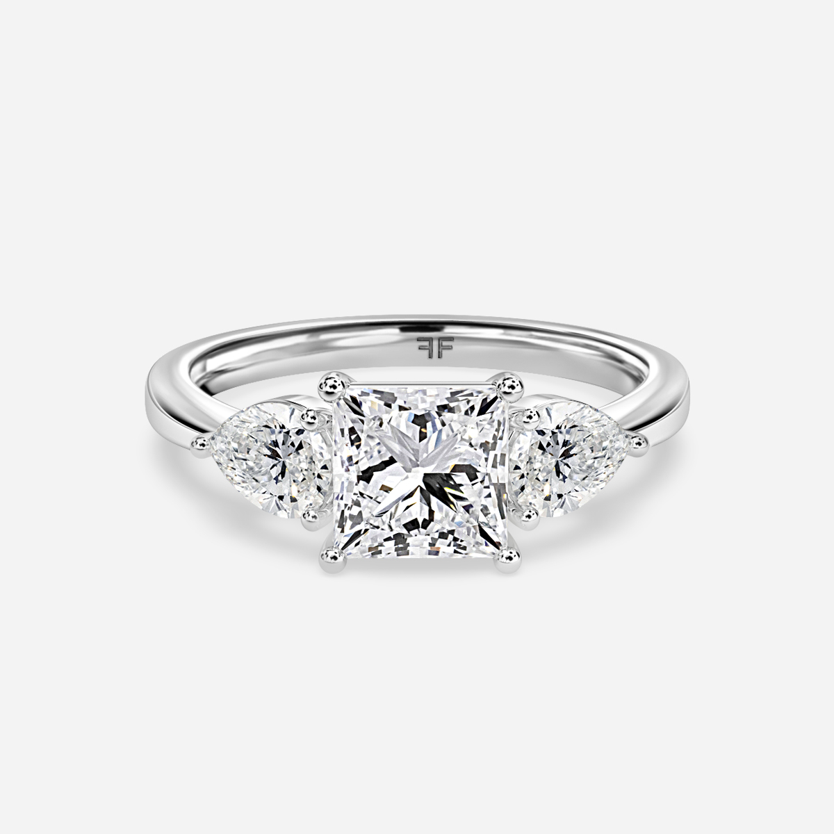 The white gold trilogy engagement ring is held in a classic four-prong setting. This ring features two exquisite side stone pear diamonds that enhance the centre stone, telling the past, present and future tale of your relationship. Handcrafted in Hatton Garden, London. Centre Diamond Not Included Setting only