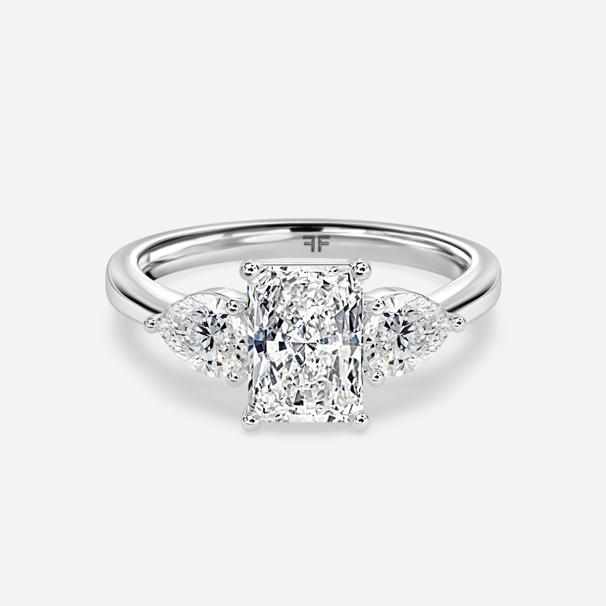 The white gold trilogy engagement ring is held in a classic four-prong setting. This ring features two exquisite side stone pear diamonds that enhance the centre stone, telling the past, present and future tale of your relationship. Handcrafted in Hatton Garden, London. Centre Diamond Not Included Setting only
