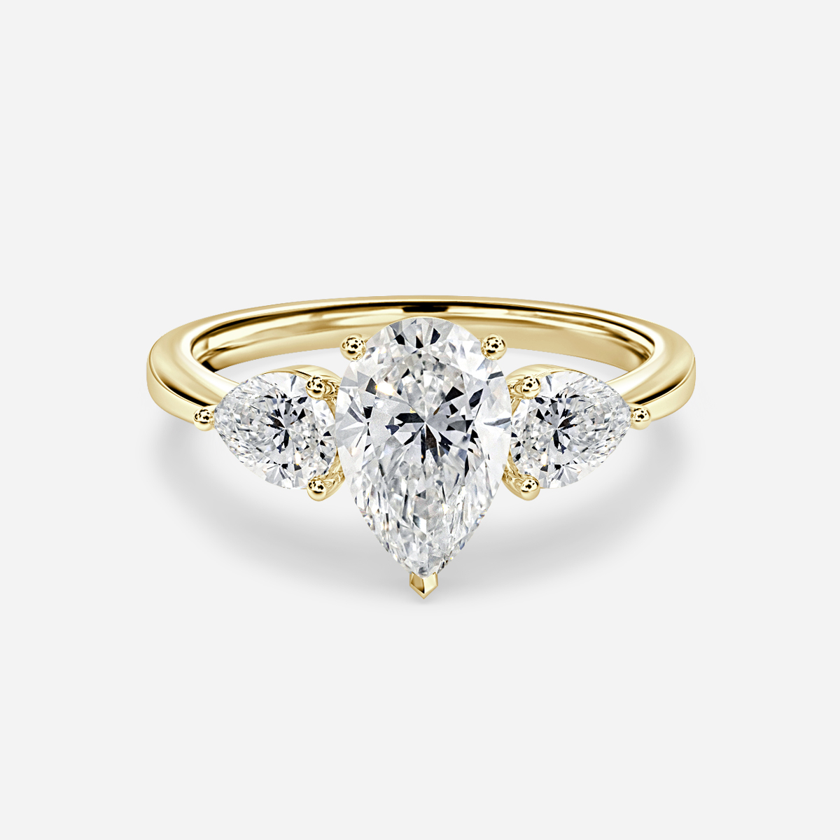 The yellow gold trilogy engagement ring is held in a classic four-prong setting. This ring features two exquisite side stone pear diamonds that enhance the centre stone, telling the past, present and future tale of your relationship. Handcrafted in Hatton Garden, London. Centre Diamond Not Included Setting only